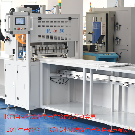除尘滤芯绑带焊接机:属于一款全自动化超声波焊接设备,本设备采用三套超声波焊接系统并联使用,采用PLC自动化编程配合多工位运动同时焊接以及切断,整机为工作台形式,由双排超声波焊接头、运动板下模具为一体、前置启动按钮、急停按钮、配电箱部分控制屏、气压表调节阀等几大版本组成,并配有照明灯、故障提醒等,动作方式为上方超声波焊头为气动控制,下方运动型下模为自动化运动。